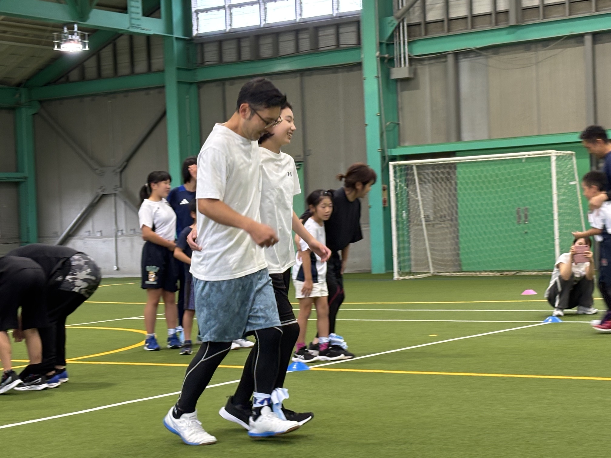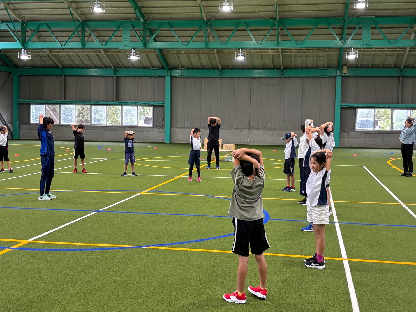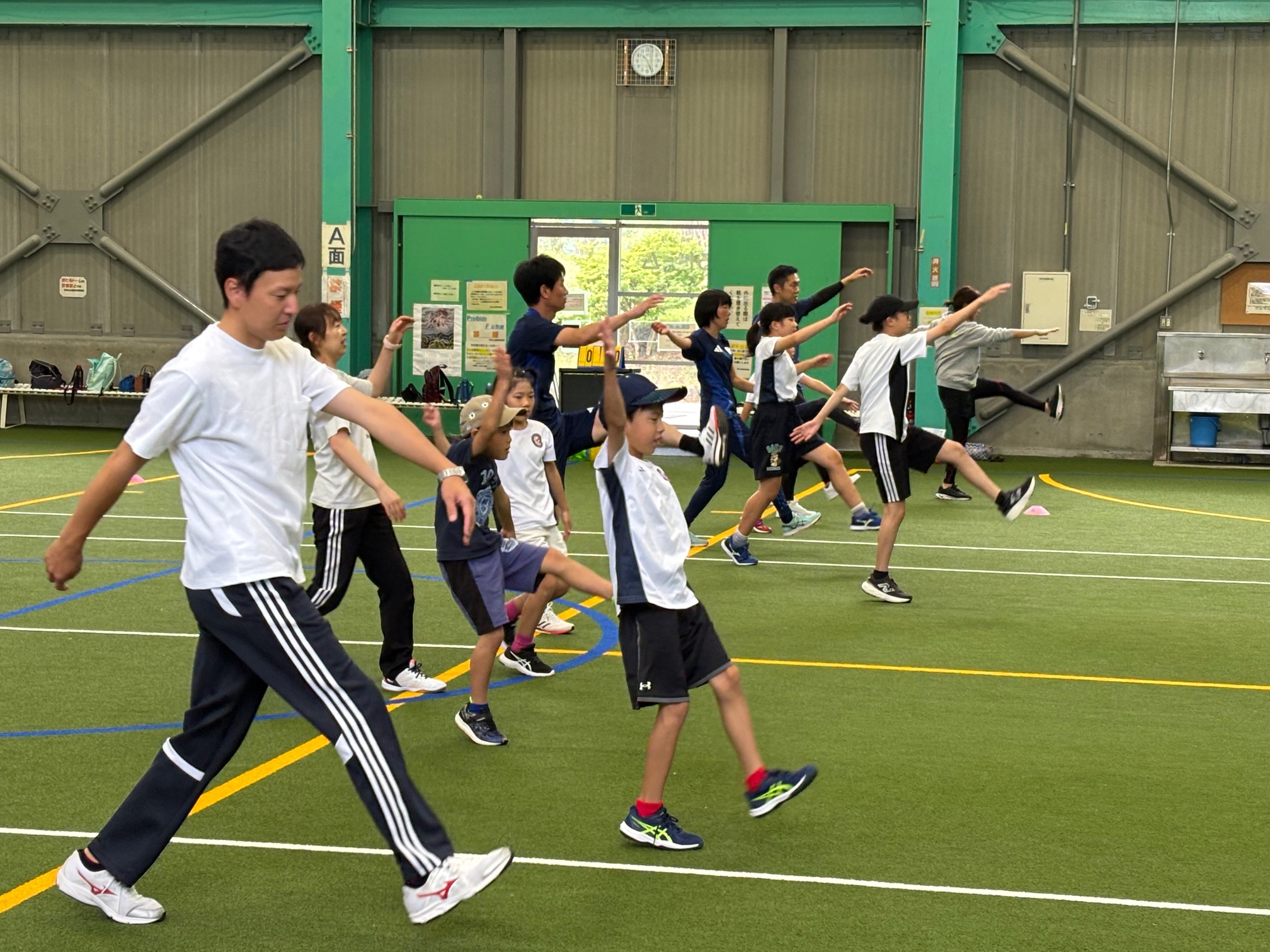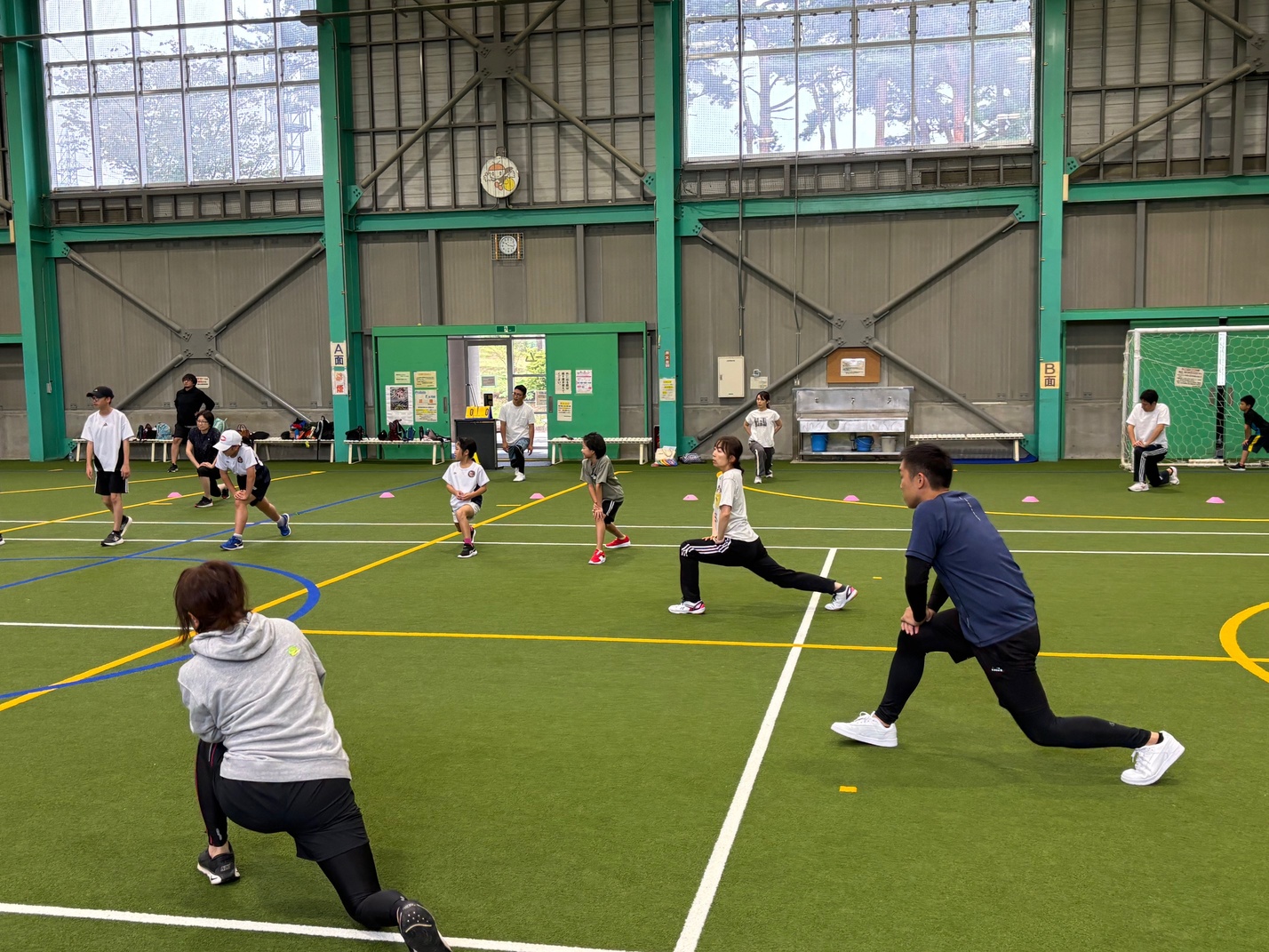 まずは、いつも練習時にやっているウォーミングアップを保護者の皆さんにも体験していただきました。ケガの予防だけでなく、パフォーマンス向上のため、大切にしている部分を説明しながら念入りに行いました。