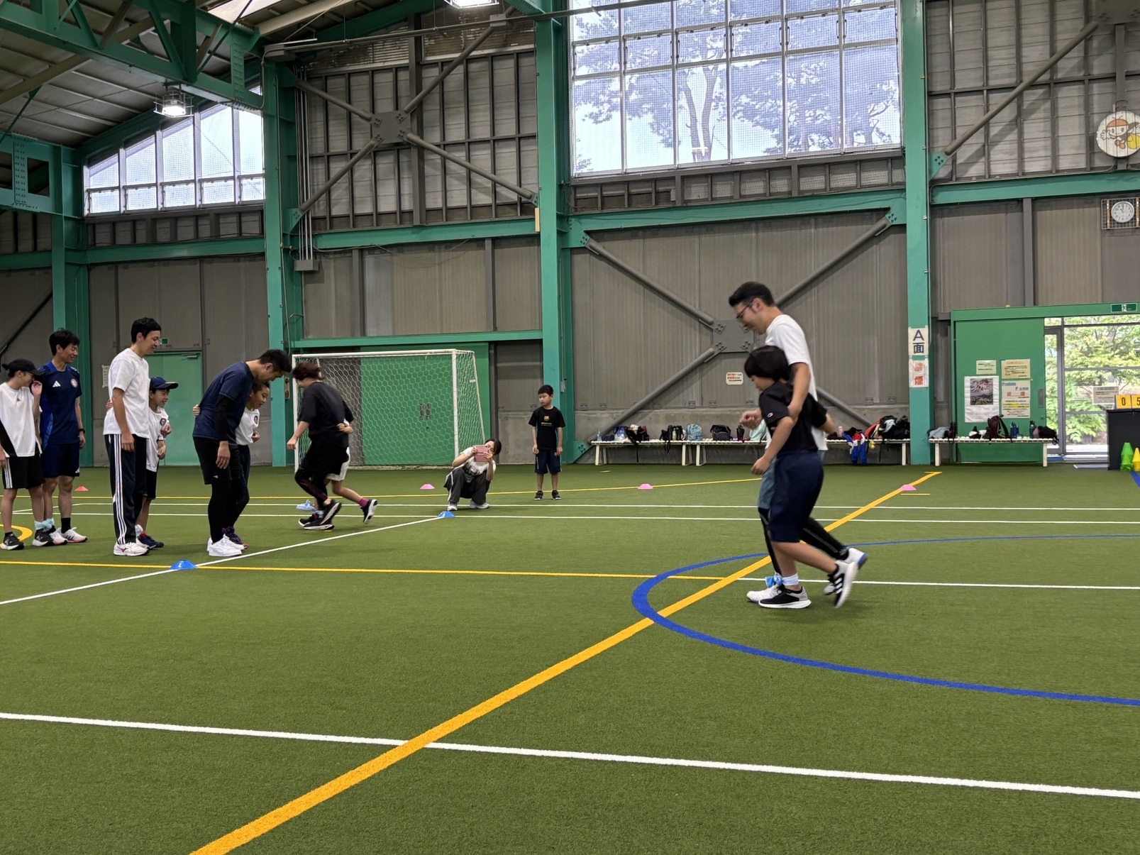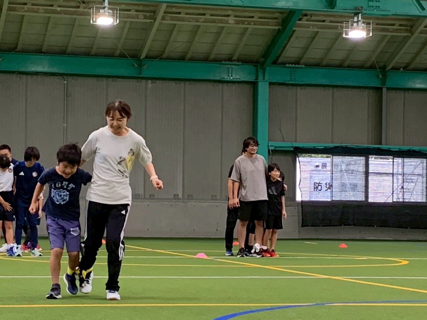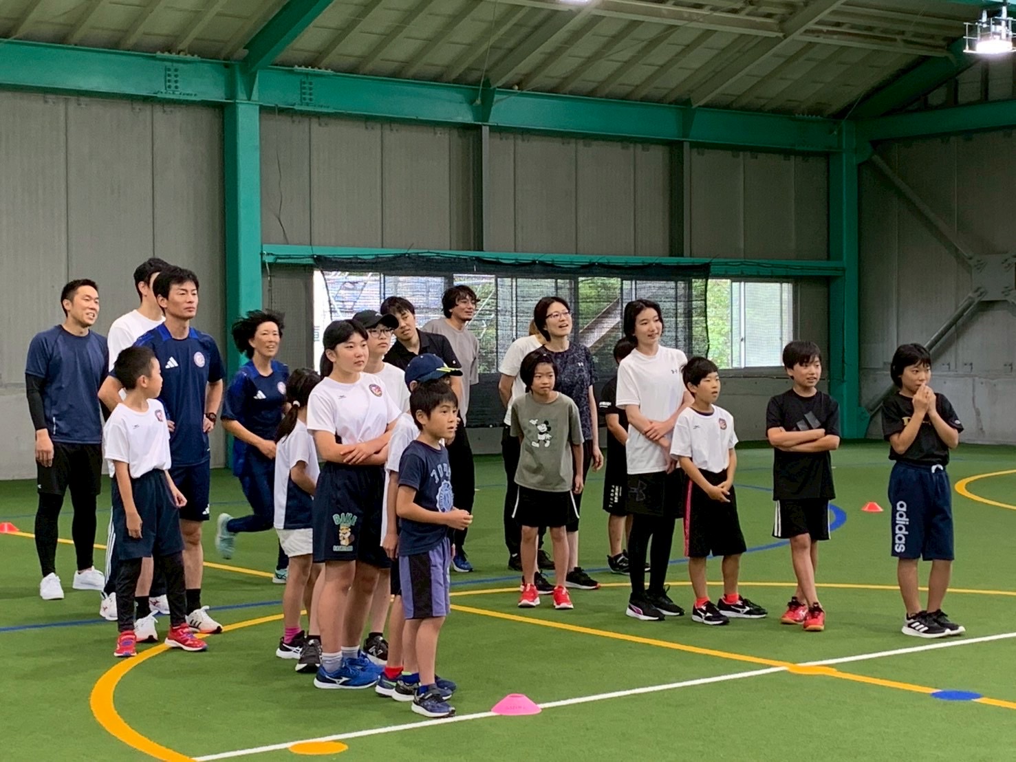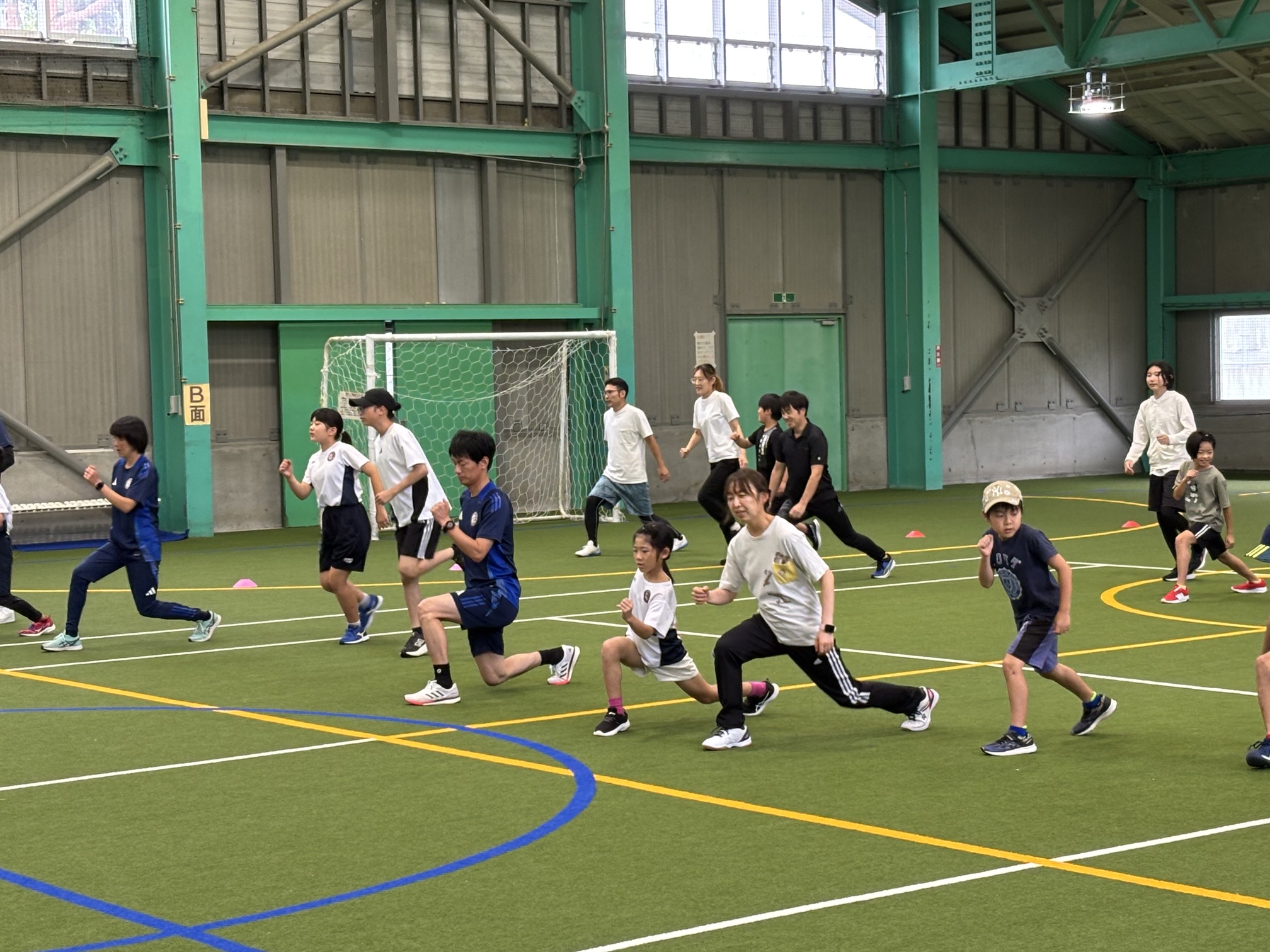 まずは、いつも練習時にやっているウォーミングアップを保護者の皆さんにも体験していただきました。ケガの予防だけでなく、パフォーマンス向上のため、大切にしている部分を説明しながら念入りに行いました。