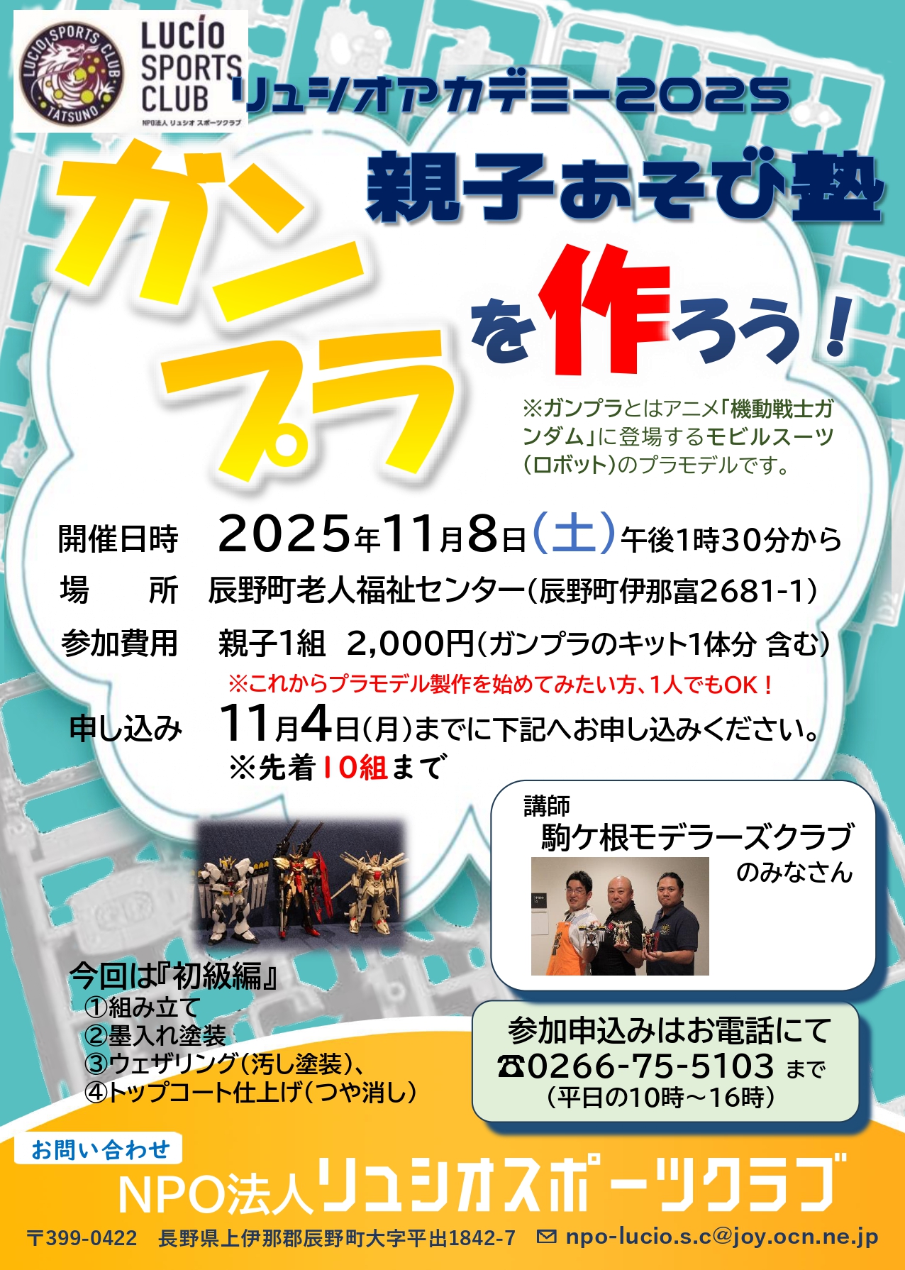 講師に駒ケ根モデラーズクラブ(KMC)の皆さんをお招きして、入門者向けのガンプラキットの①組み立て、②墨入れ塗装、③ウェザリング(汚し塗装)、④つや消しトップコートをしてカッコよく仕上げるところまでご指導いただきます。