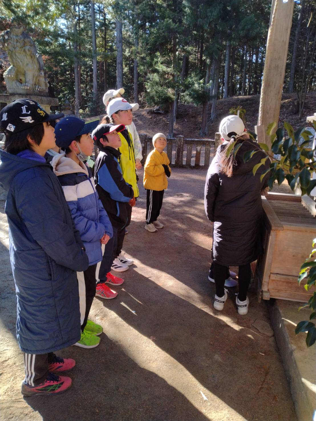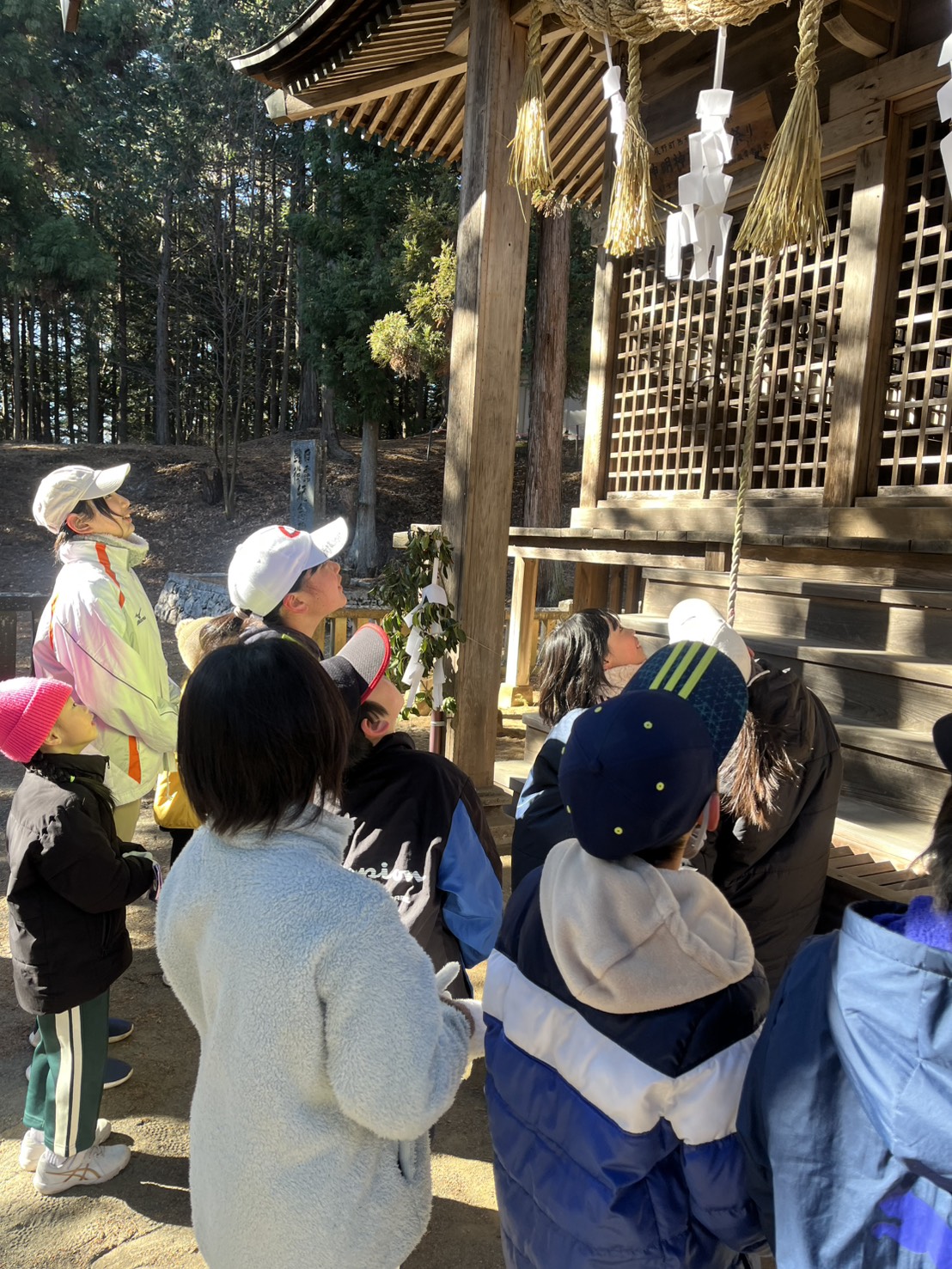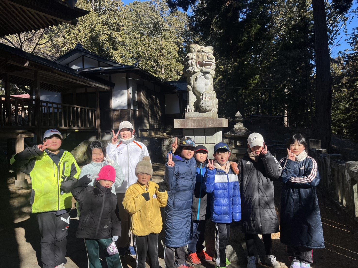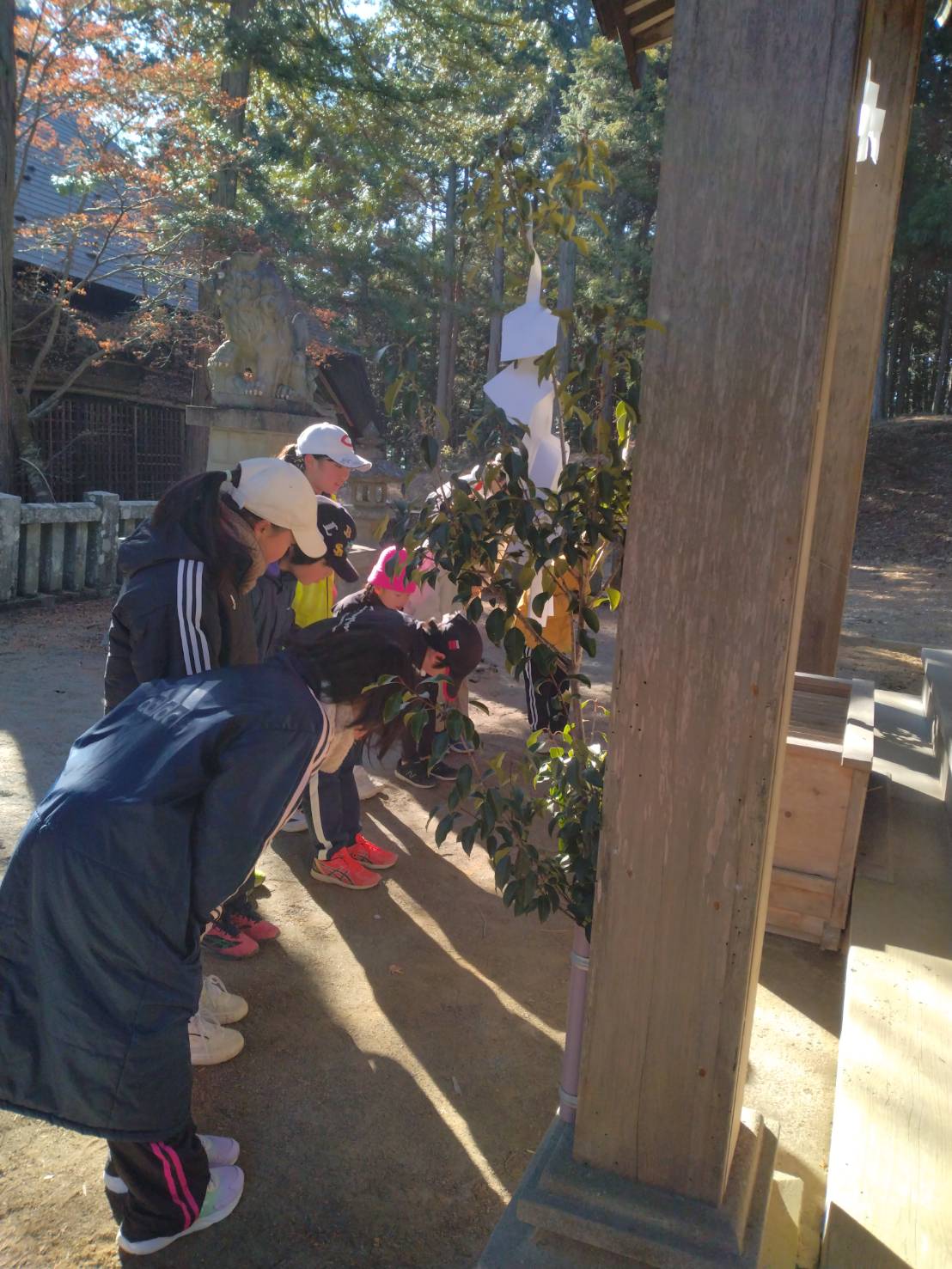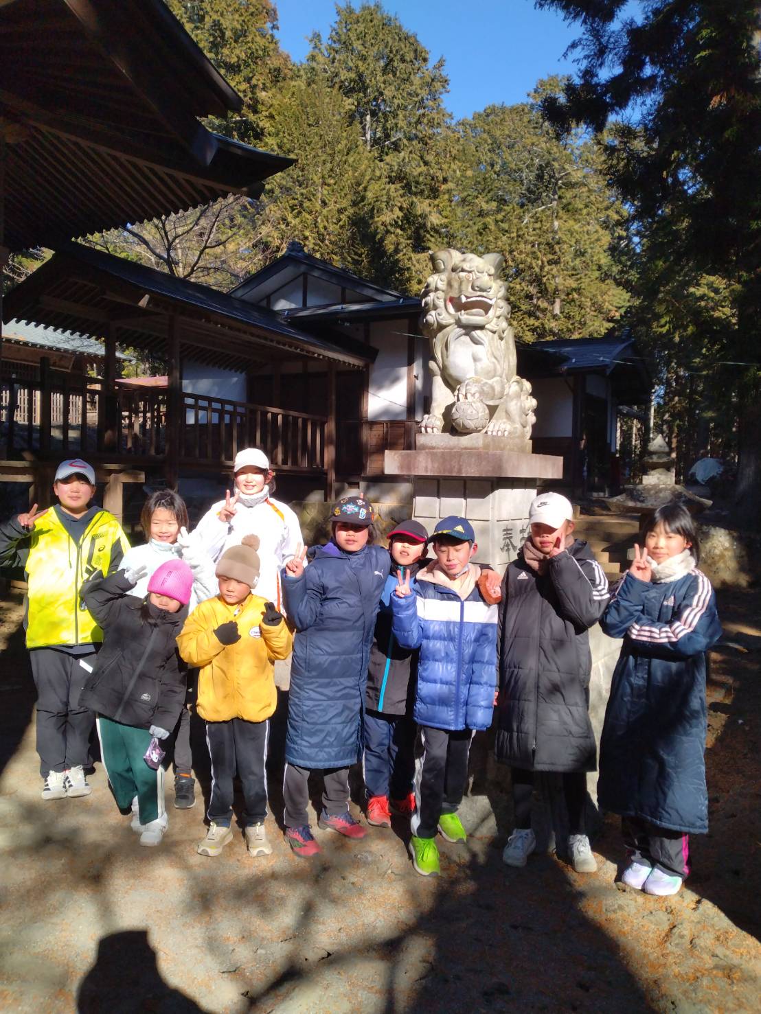 この連休を使って多くの地区で行事(どんど焼き)が開催されるため、参加者はいつもより少なかったのですが、初練習恒例となった社会体育館の近くの神明神社までみんなで参拝にいきました。