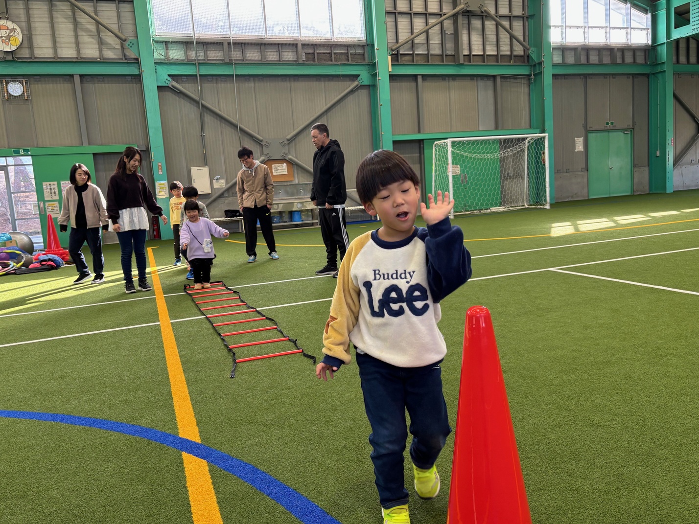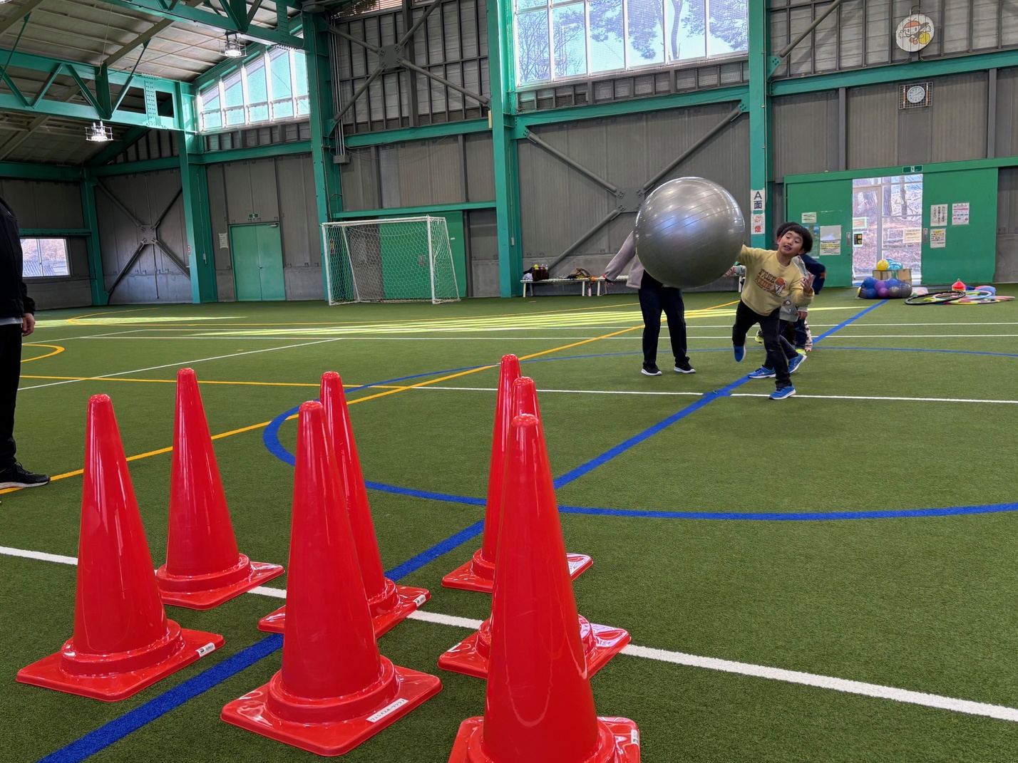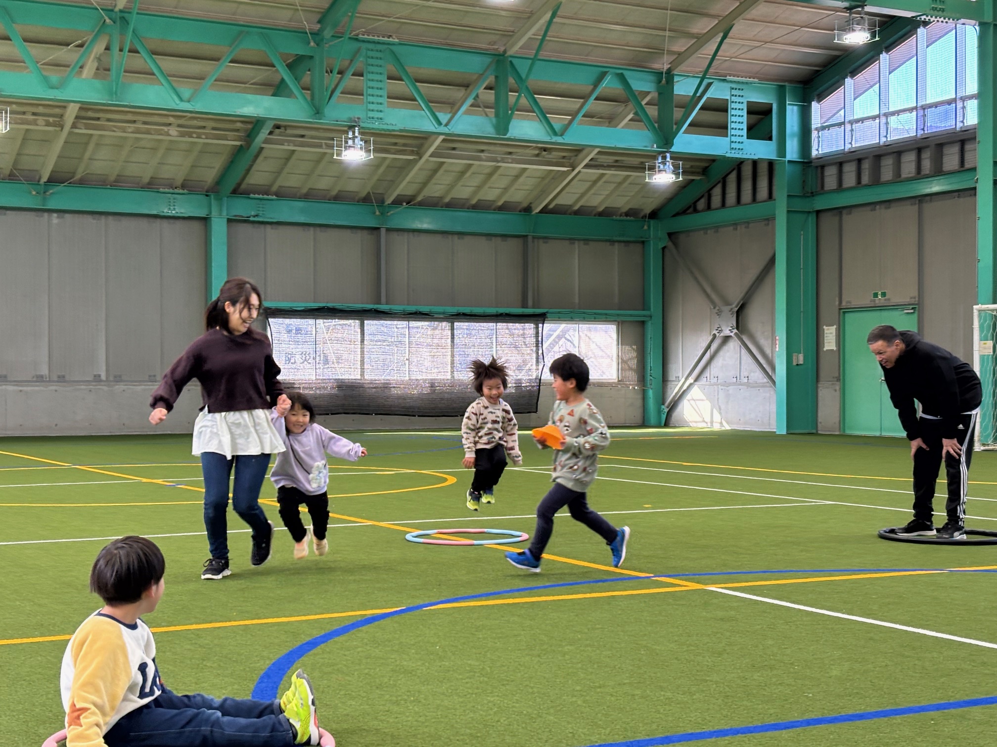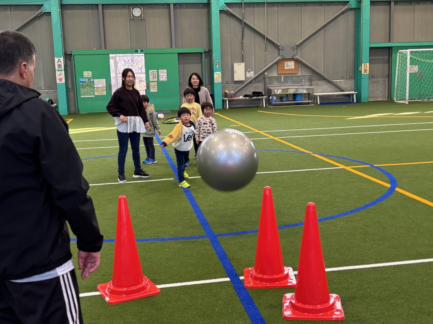 カナダ出身のパット先生と一緒にいろんな遊びや運動をしながら、少しずつ英語に触れ合っていくリュシオアカデミー2025『パット先生の英語と運動教室』が荒神山スポーツ公園内のほたるドームで開催されました。