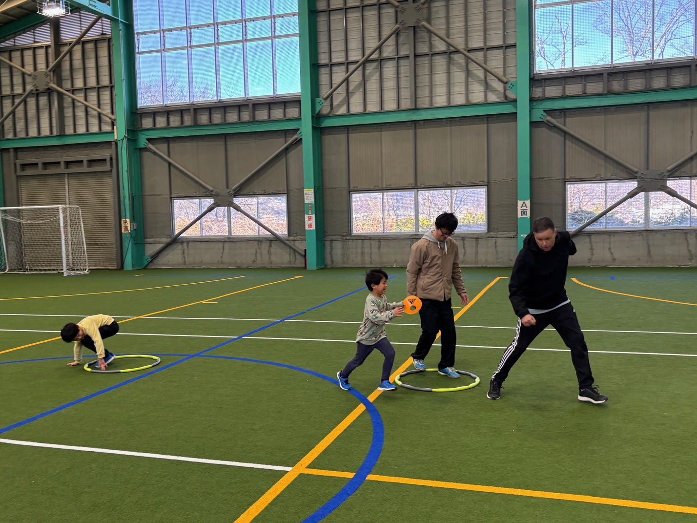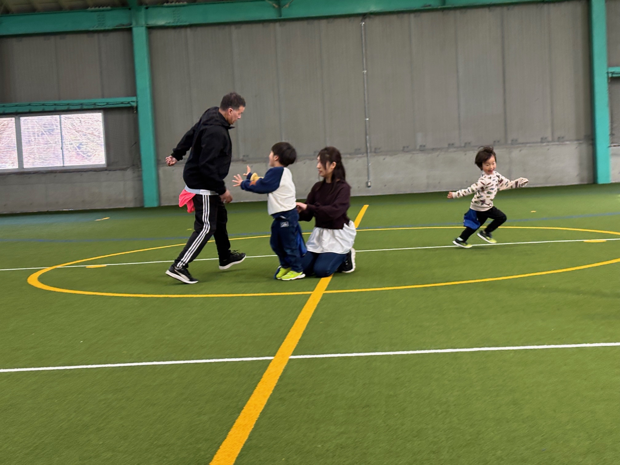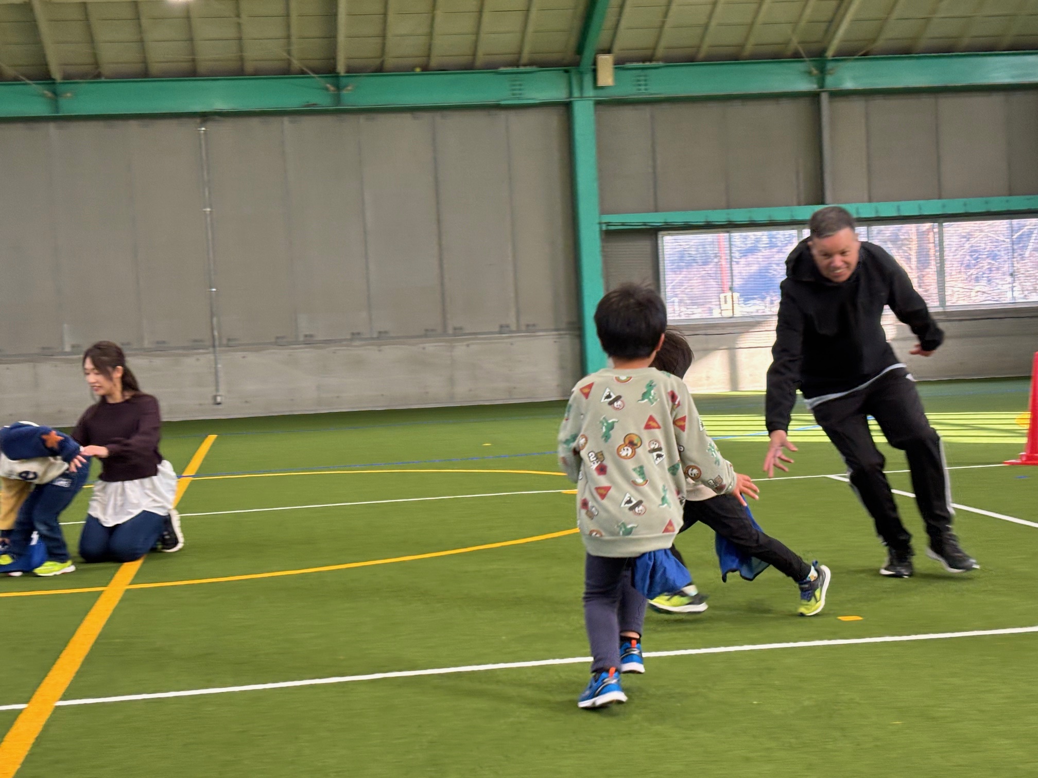 カナダ出身のパット先生と一緒にいろんな遊びや運動をしながら、少しずつ英語に触れ合っていくリュシオアカデミー2025『パット先生の英語と運動教室』が荒神山スポーツ公園内のほたるドームで開催されました。