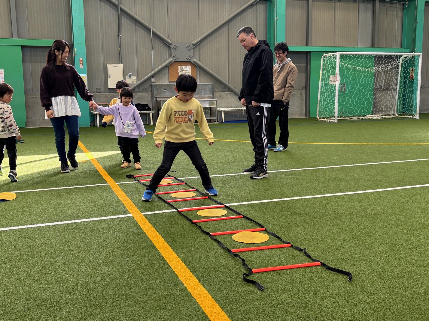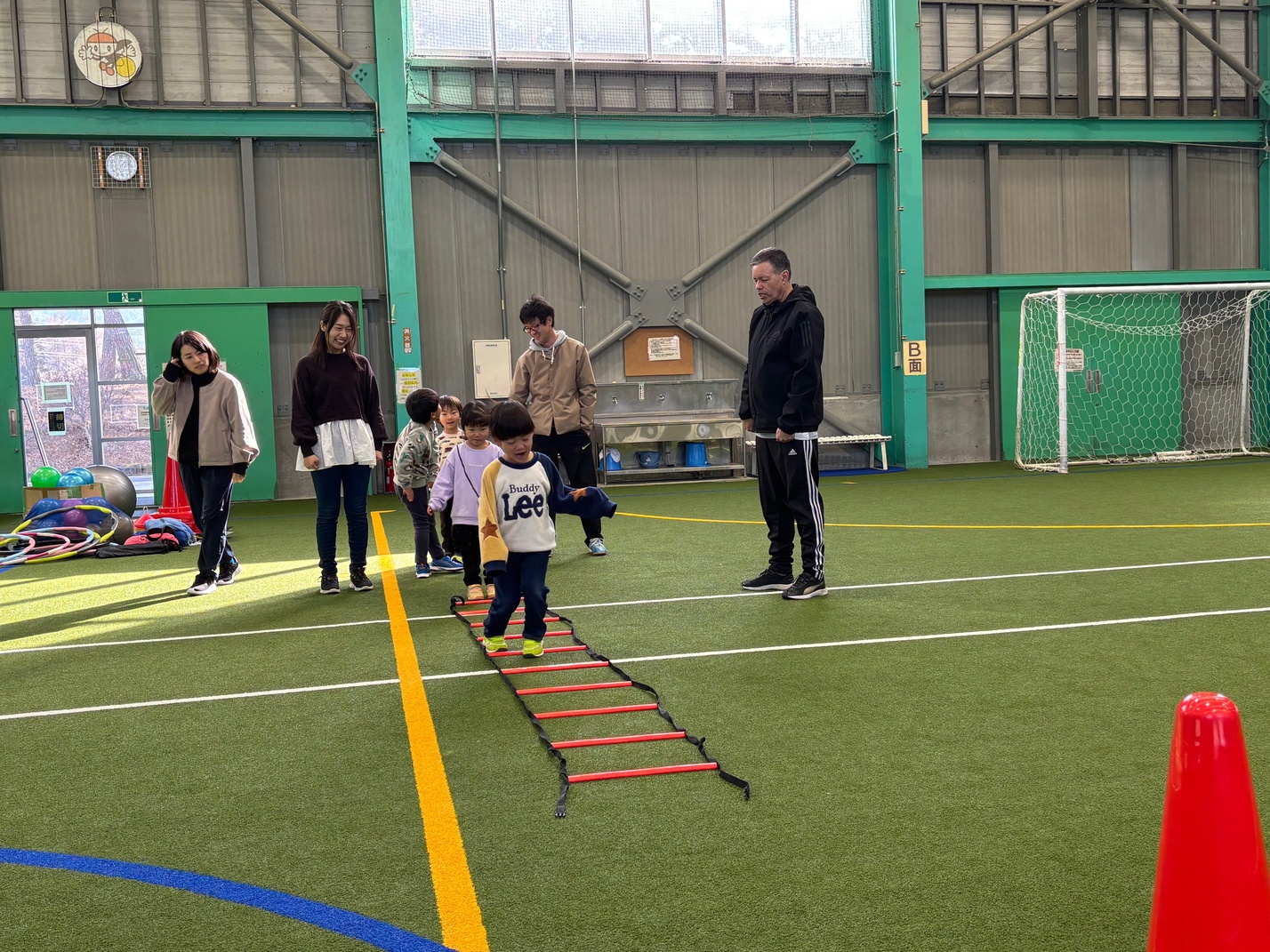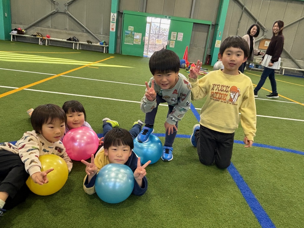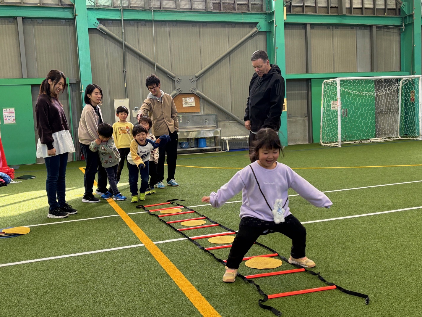 カナダ出身のパット先生と一緒にいろんな遊びや運動をしながら、少しずつ英語に触れ合っていくリュシオアカデミー2025『パット先生の英語と運動教室』が荒神山スポーツ公園内のほたるドームで開催されました。