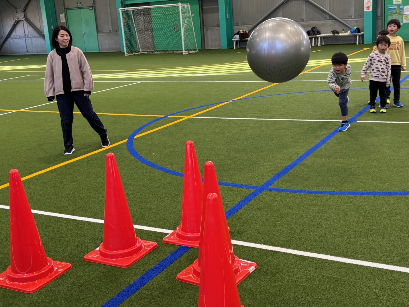 最初はうまく投げられず、苦戦していましたが、だんだんとボールが前に飛ぶようになってパイロンも倒せるようになりました。