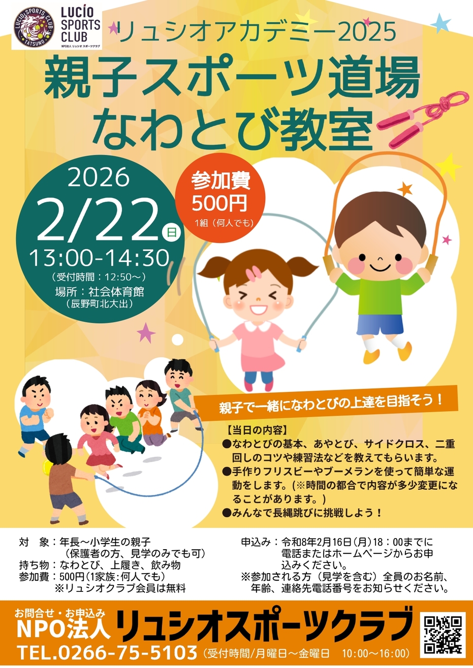 なわとび、上履きシューズ、飲み物、タオル(必要に応じて)