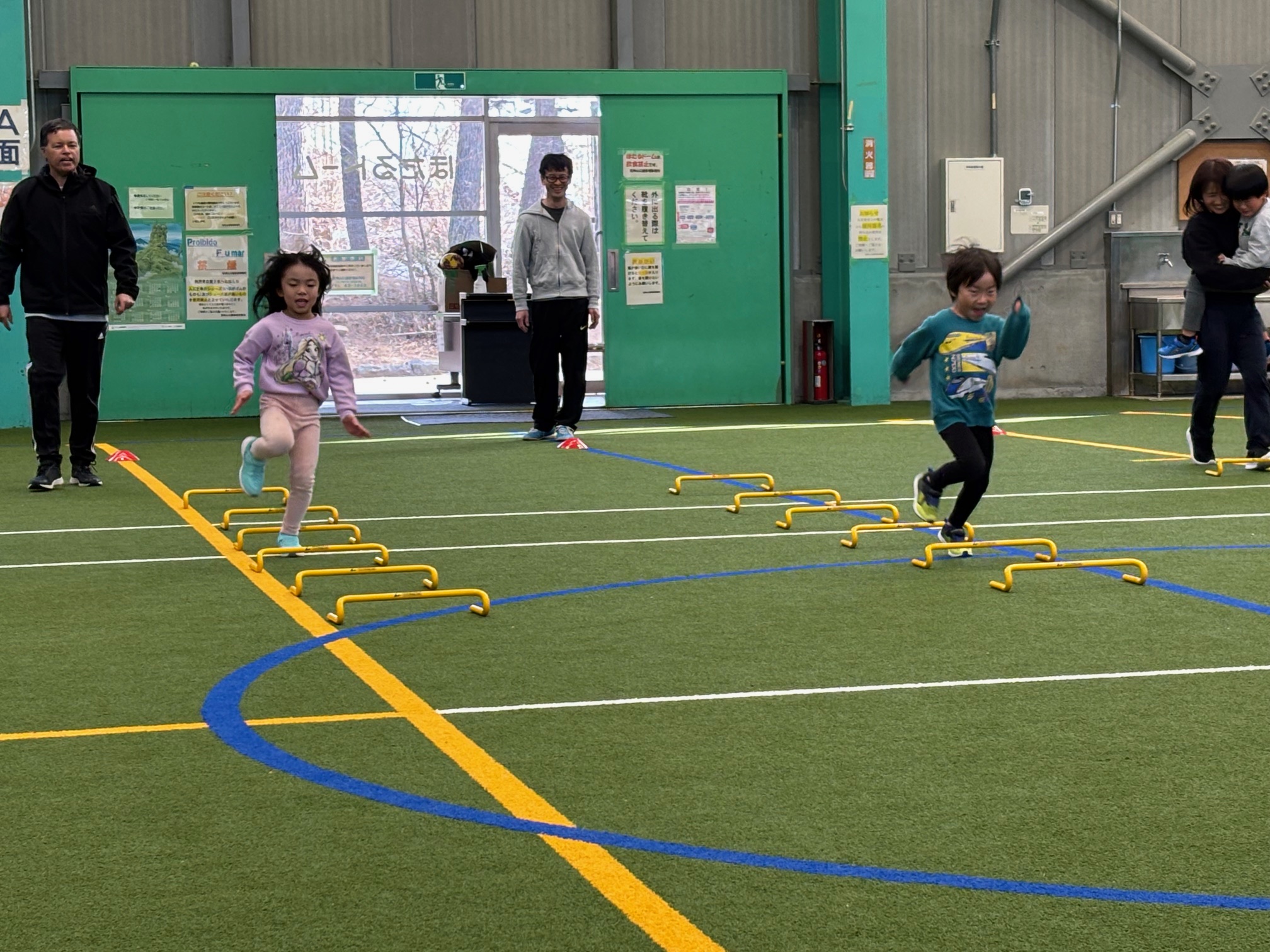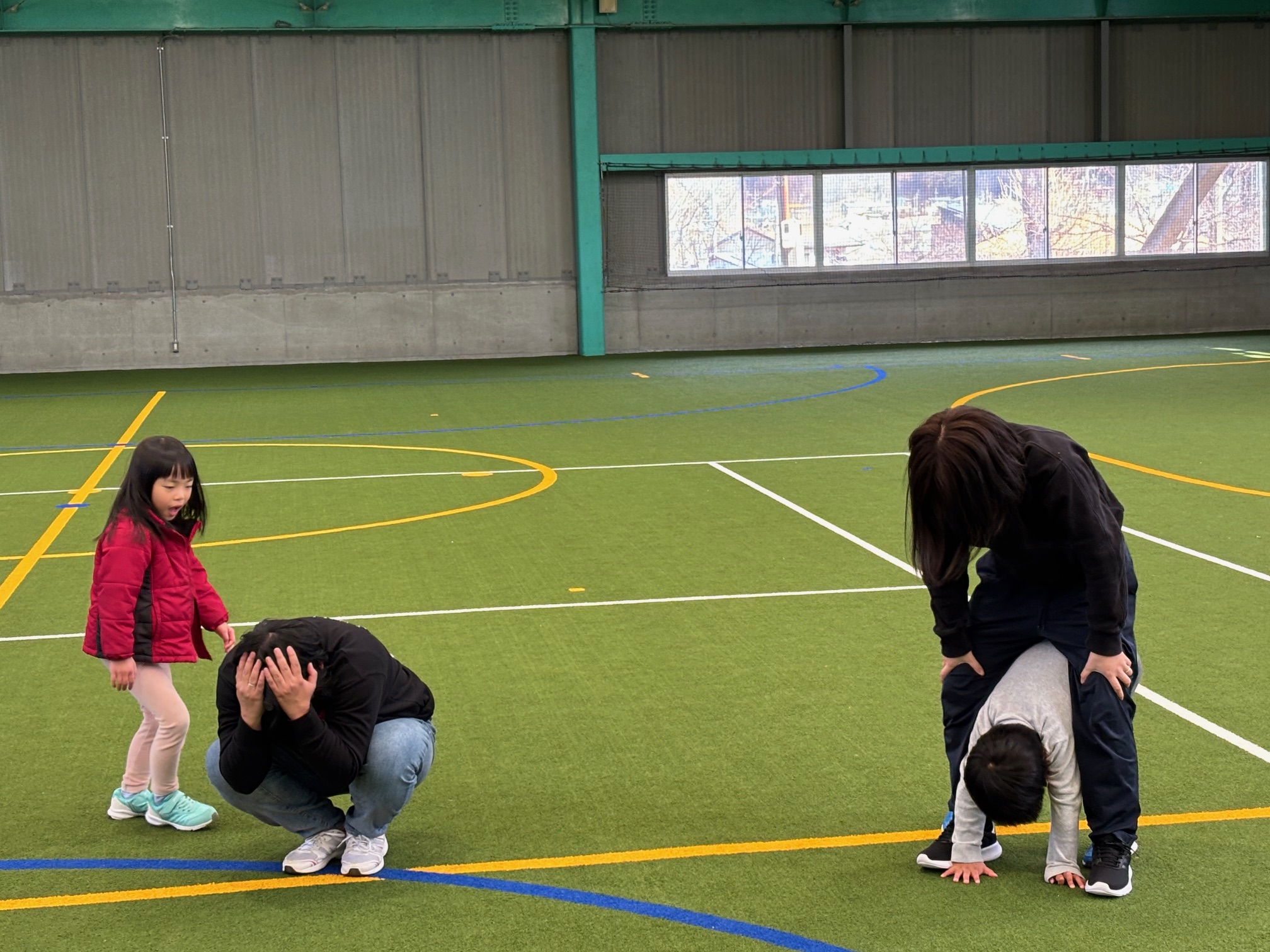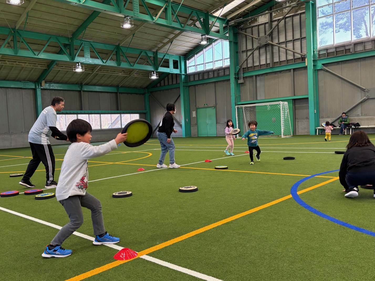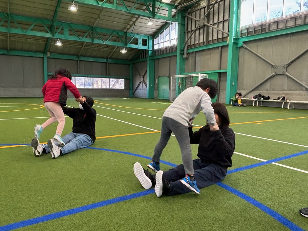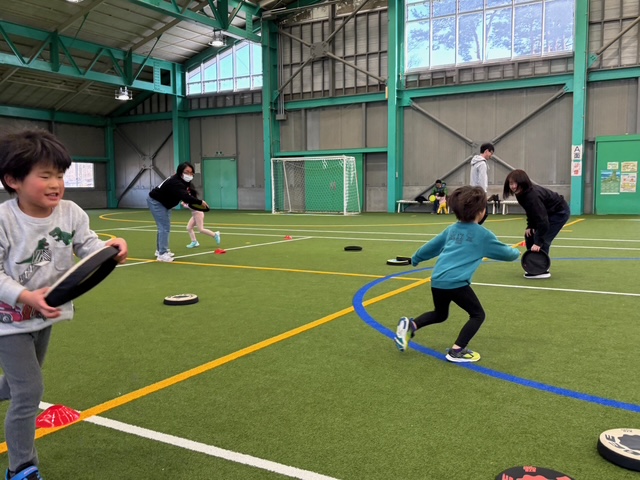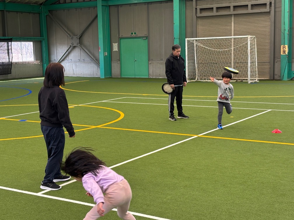 カナダ出身のパット先生と一緒にいろんな遊びや運動をしながら、少しずつ英語に触れ合っていく『リュシオアカデミー2025 パット先生の英語と運動教室』今年度最後の教室が荒神山スポーツ公園内のほたるドームで開催されました。