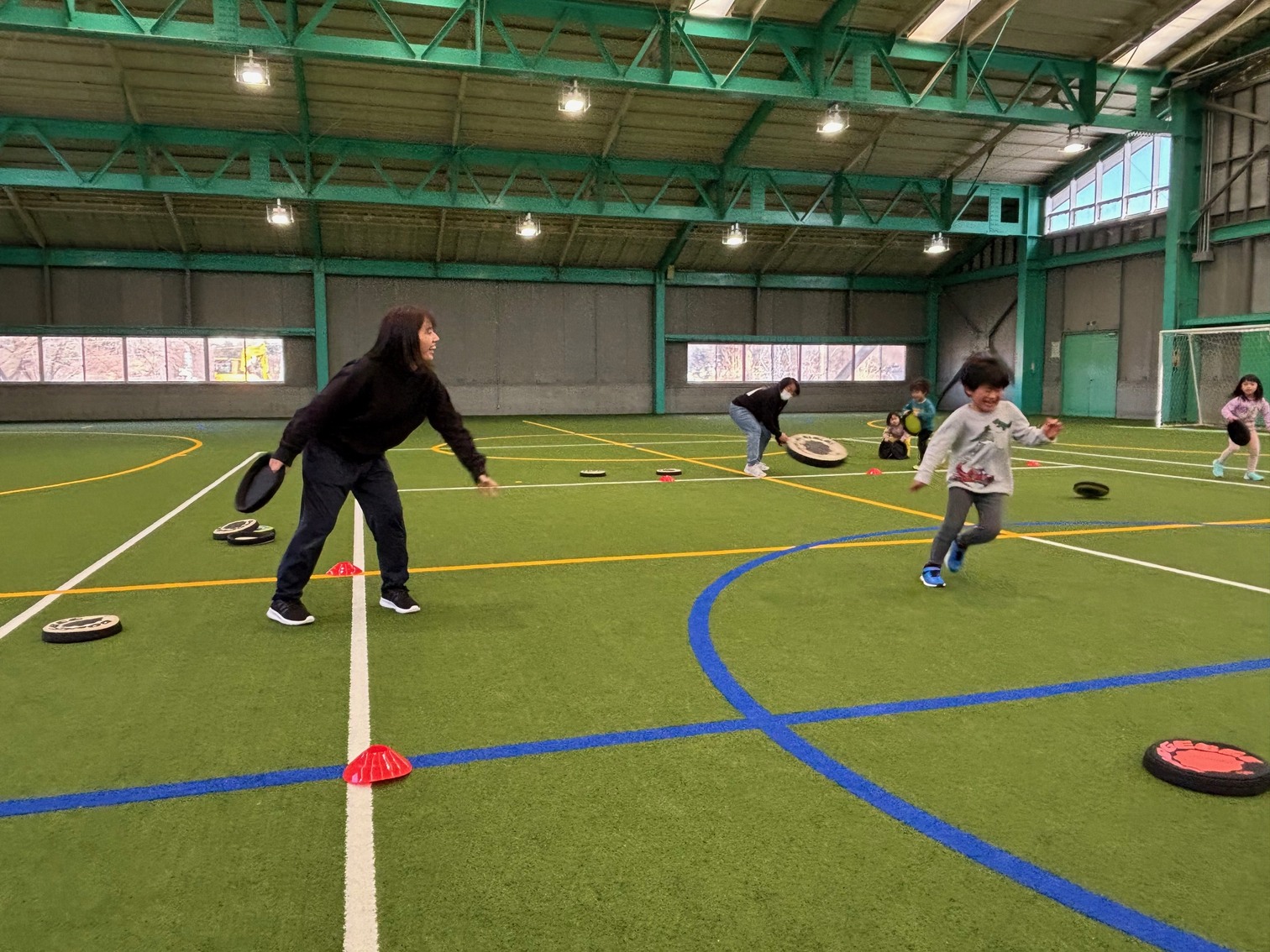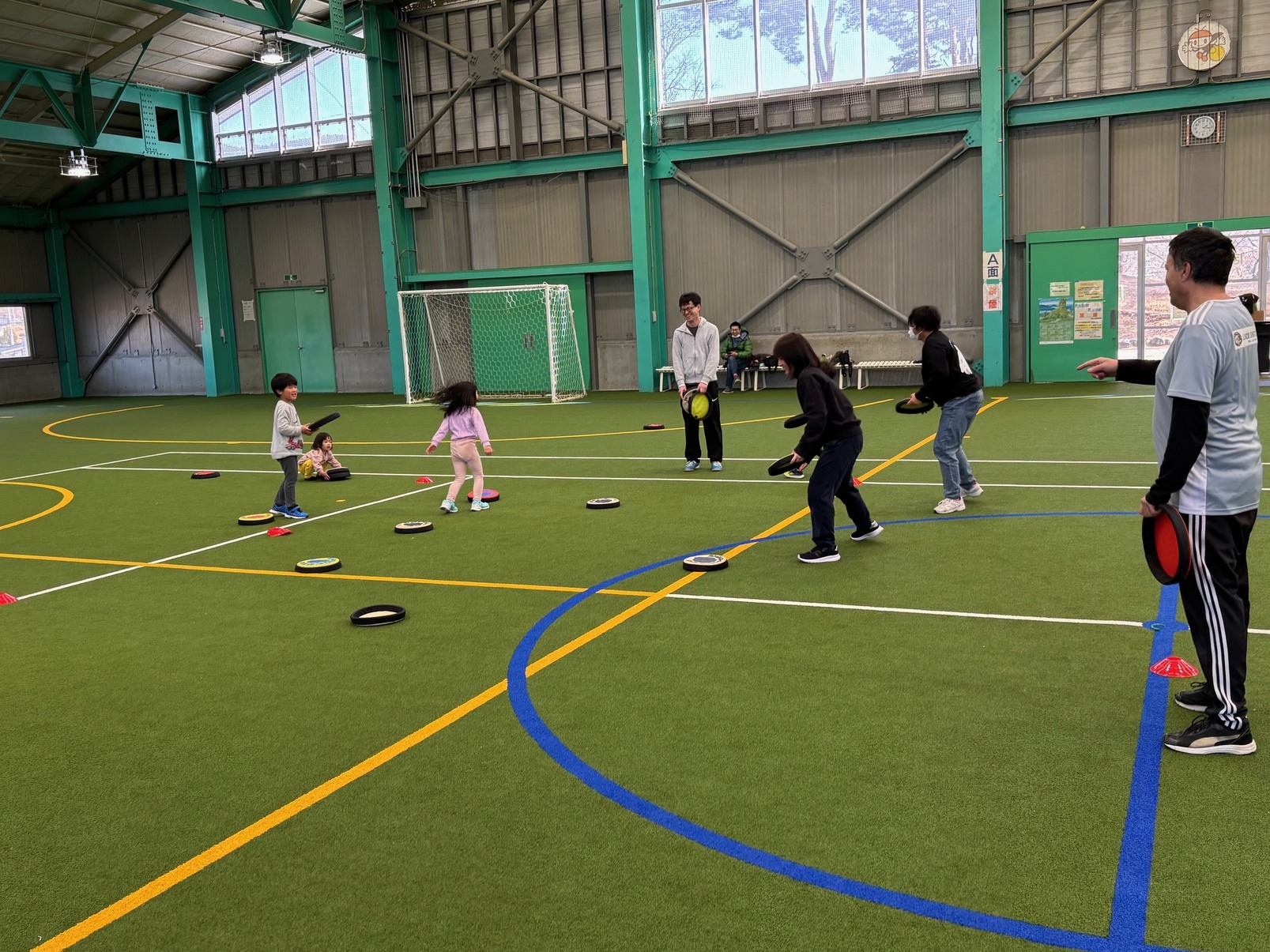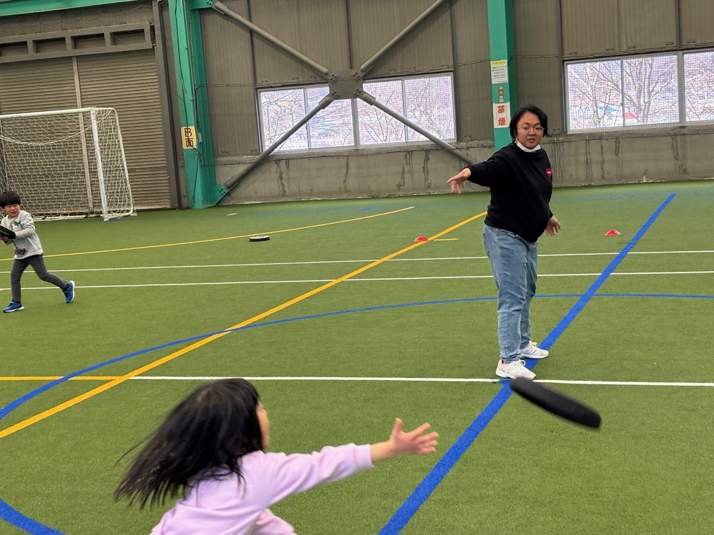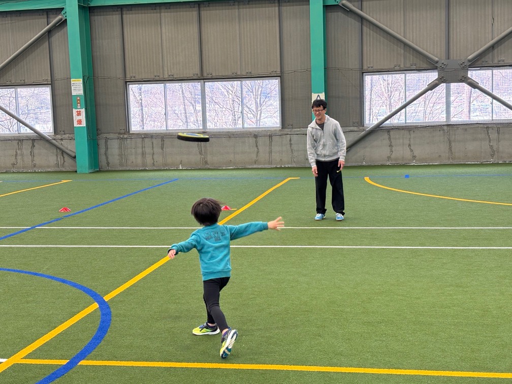 親子ペアになって基本的な投げ方、両手でのキャッチ(挟み、掴み)を練習してから、最後は片手キャッチにも挑戦しました。